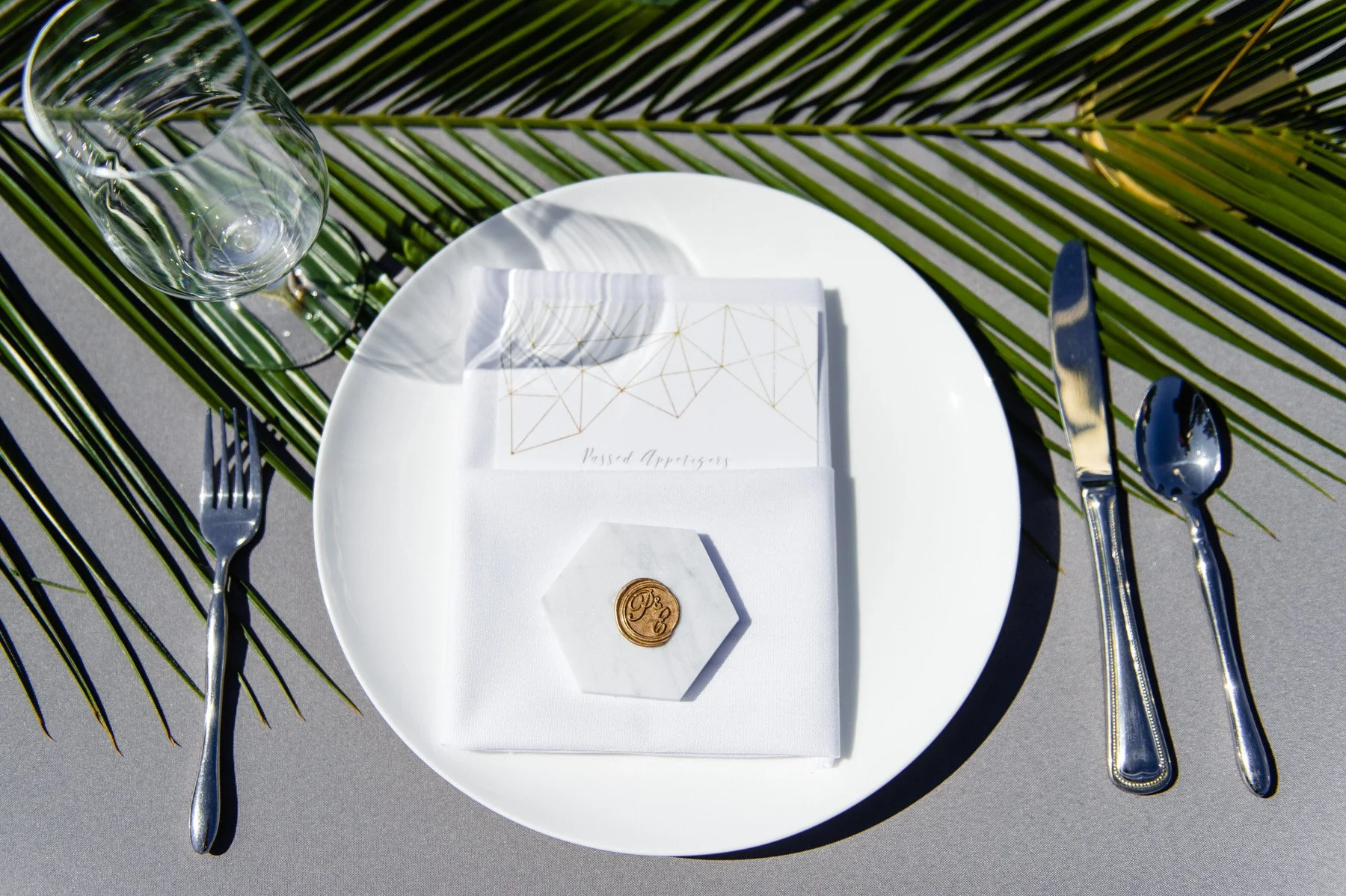 I found 3-inch hexagon shaped marble carrera tiles on Amazon that would be perfect for the task, but since I wasn’t writing guests’ names on each place setting I wanted to add something to the tiles to personalize them. One day, it clicked and I thought, OH! I’m going to stamp them with the same personalized wax seal stamps we used for our invitations! It ended up being one of my favorite elements, and I’m forever grateful to my friends for stamping each and every tile the weekend of the wedding!”