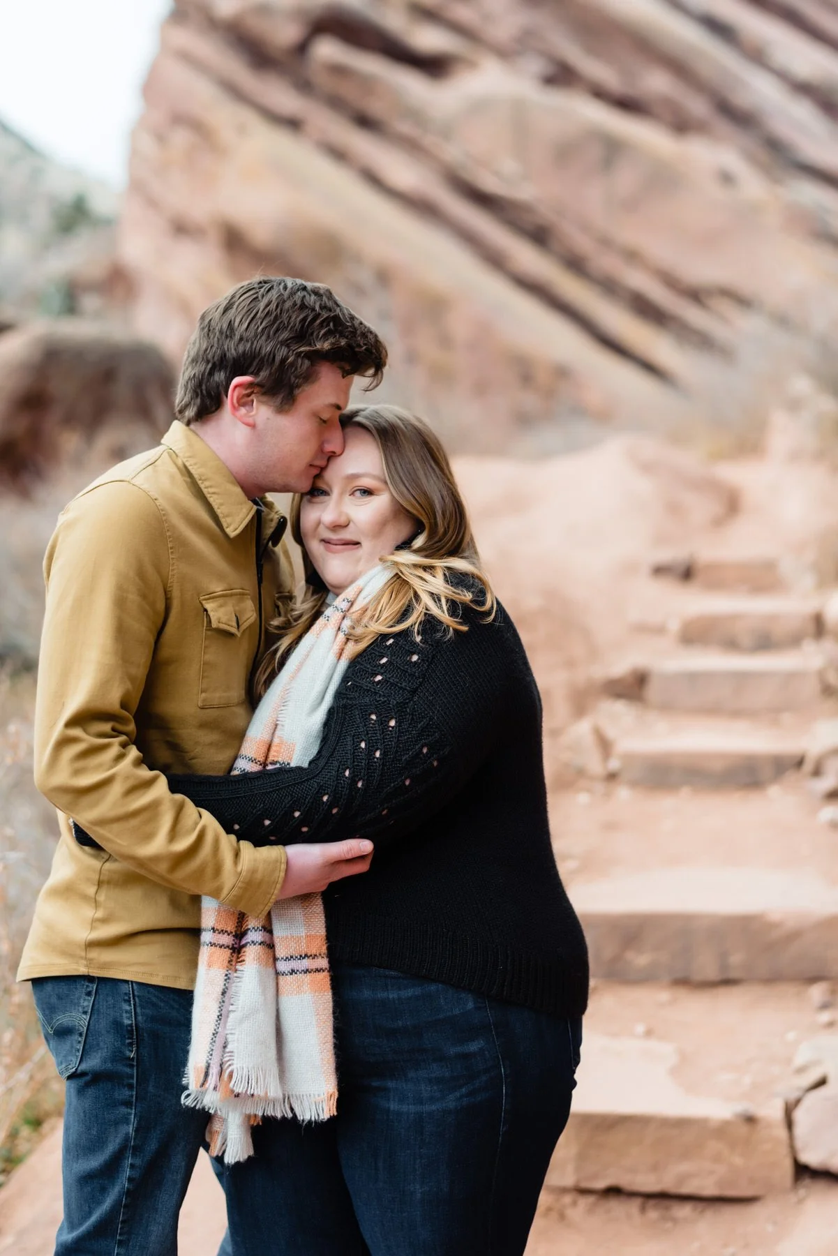 If you’ve never been, Red Rocks Park and Amphitheater is one of Colorado’s most iconic outdoor venues, famous for its towering red sandstone formations, panoramic mountain views, and world-class concerts- I’ve even attended a few there myself! In the winter, the trails and amphitheater steps are quieter, making it the perfect backdrop for a romantic engagement shoot. The contrast of the snow against the deep red rock created a dreamy, intimate setting that felt like it belonged entirely to Sarah and Jake! (Which it totally did!)