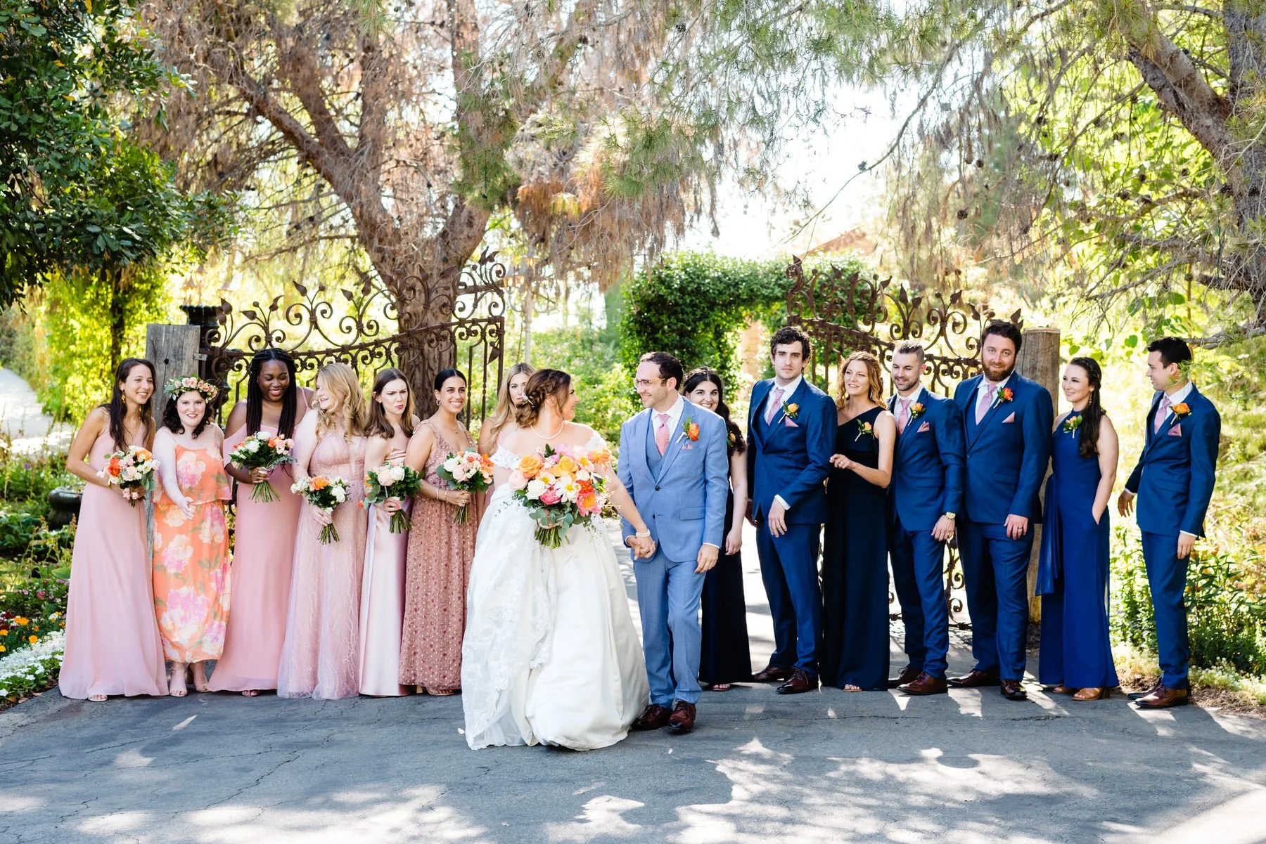 We took wedding party photos in front of a traditional iron gate with shadows dancing in the trees all around them. The wedding party wore a mix of light blush tones and navy blues, carrying bouquets from Allen’s Flowers that had bright pops of peaches and pinks. The tones of the day were perfect for a summery California garden wedding!