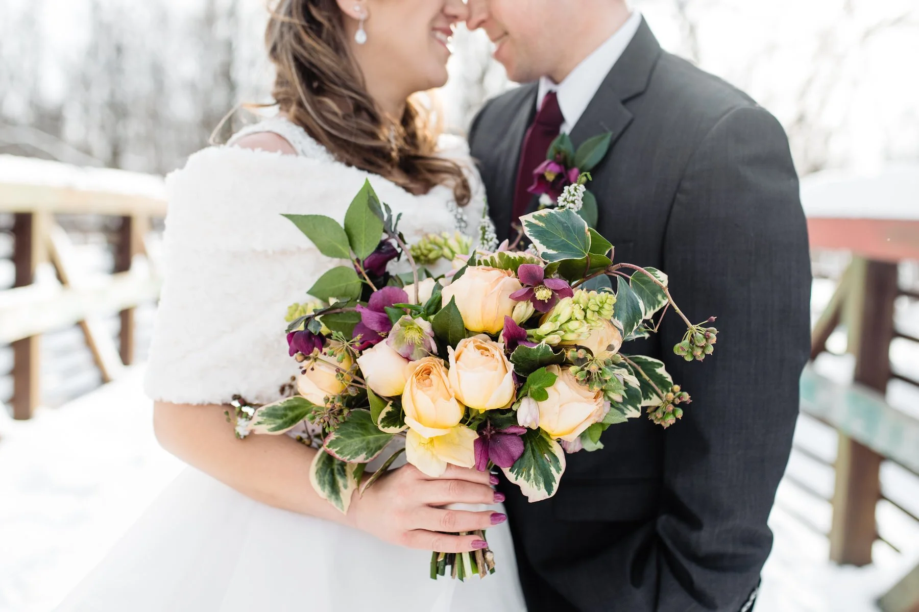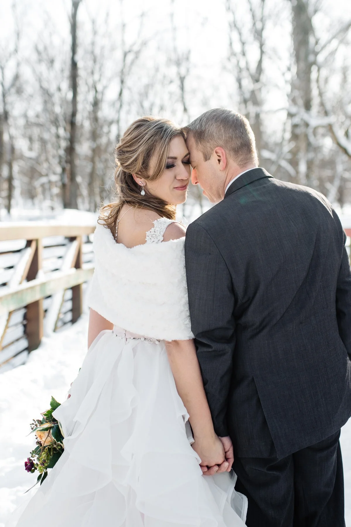Diana's princess dress "Morilee by Madeline Gardner" was perfect for the winter wonderland and 15 degrees Chicago had turned into. With help from Lilput to create a perfect winter bouquet filled with garden roses, hellebore, and touches of bush ivy. The whole look was made perfect by the MUAH by Amelia C & Co, creating light curls that lasted through the wind, and using Diana's EnVogue Bridal Accessory from her wedding.